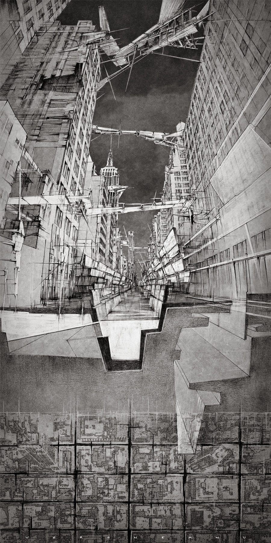 At the lowest level, a new city will gradually emerge as trade paths are being formed between adjacent island-blocks. These paths will originate in multiple points across Manhattan and grow into a rhizomic network of carved streets and bridges. Its intricate structure will expose one of Manhattan’s hidden cities: the medieval metropolis. At median level, a third plateau emerges as roofs become gradually converted into food gardens. Initially serving each block’s individual needs and fed off by the surrounding canals, the gardens will grow into one another forming a continuous farmland. This new layer exposes another unfinished project: the modernist vision of towers in open space. The last plateau is supported by Manhattan’s tallest. Devised to harvest energy at high altitudes, the growing limbs of skyscrapers will gradually join to form new power networks. This newly created landscape of energy flows reveals another hidden layered: pyramids, neo-gothic spires, neoclassical tops, and steel antennas posing as a city of monuments.