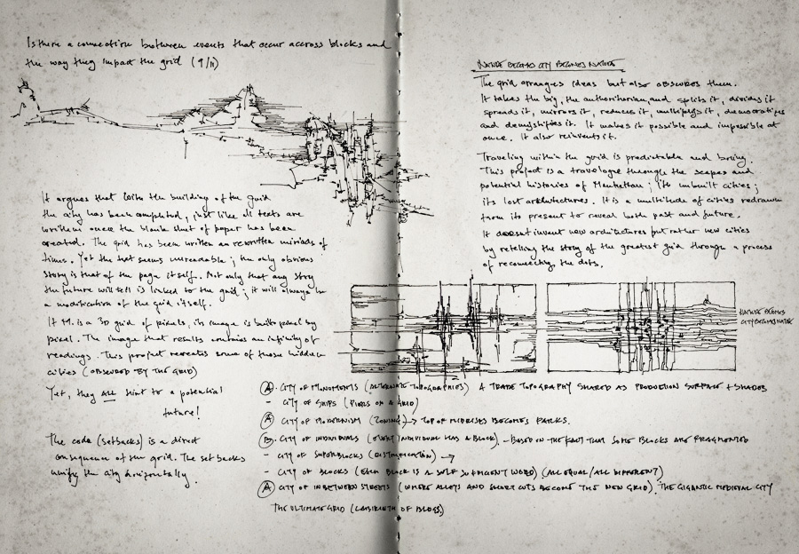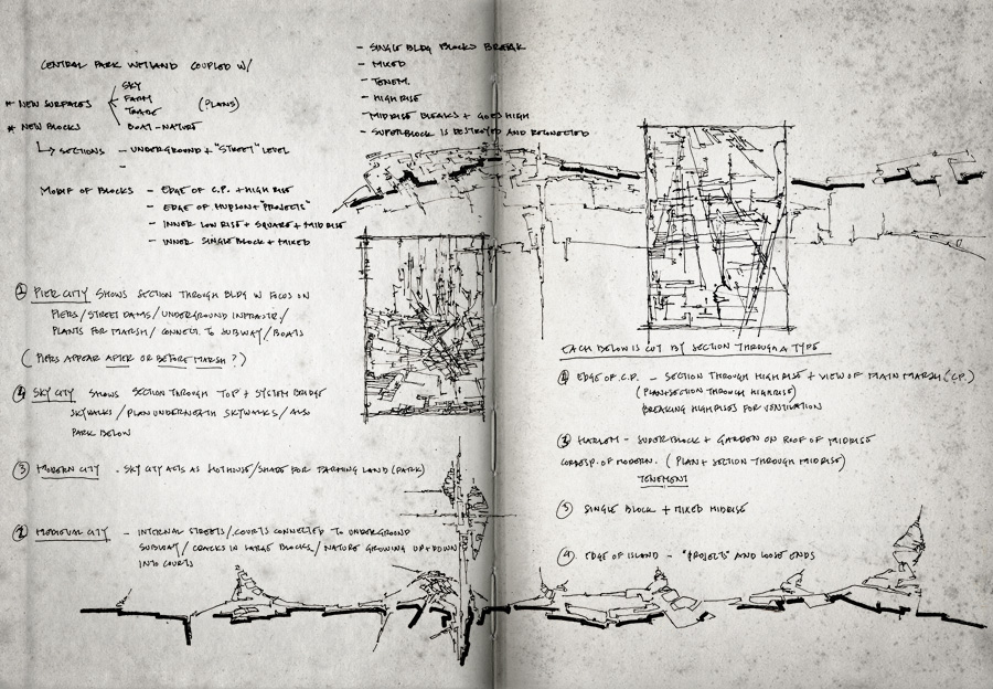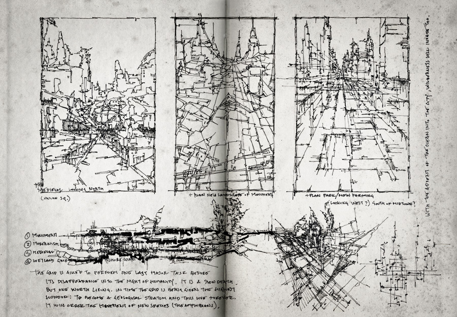 The project proposes the construction of a new infrastructural layer woven into the Manhattan grid by allowing the surrounding waters to enter the city. The new layer - a vast network of canals duplicating the street grid - will perform a series of functions throughout the life of city's reconstruction and rehabilitation. On one hand, the canals will handle water overflow from rising tides. As the waters rise, the canals' walls will continue to be built up, transforming the new layer into a multistory infrastructural network. On the other hand, the canals will weave into the city a new ecological plateau capable to feed into the energy flows of the island. Intimately linked with existing infrastructural networks and desalination filters, the new waterscape will be used for transportation, fishing, algae production, irrigation, hydropower, waste management, and water recycling via artificial wetlands constructed in city’s parks.