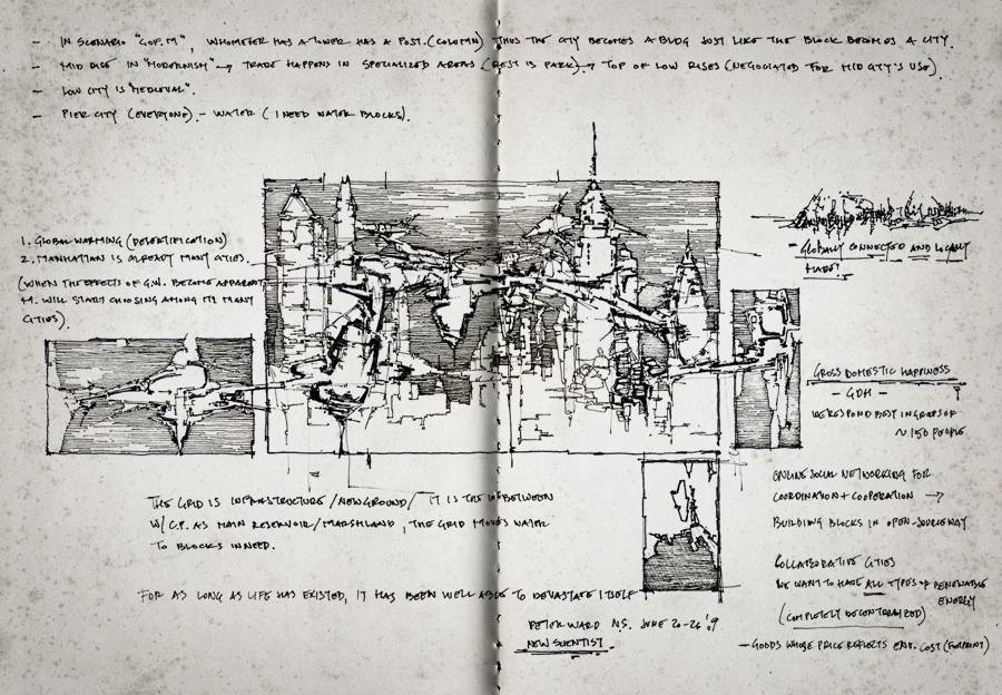 Although it connects the entire island by water, the canal grid will also act as a segregator, allowing each block to develop independently as a self-sustaining island. Here, new ways of building become linked to novel social practices and organic processes. The relative isolation of city blocks encourages the formation of new communities as alternate societies capable to address environmental issues and energy needs in ways specific to each block's built configuration. Each island is conceived as a laboratory aimed at becoming an off-grid self-sustaining unit. In this process of ruin appropriation and boundary negotiation, a new urban vernacular based on permanent invention and adaptation arises.