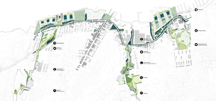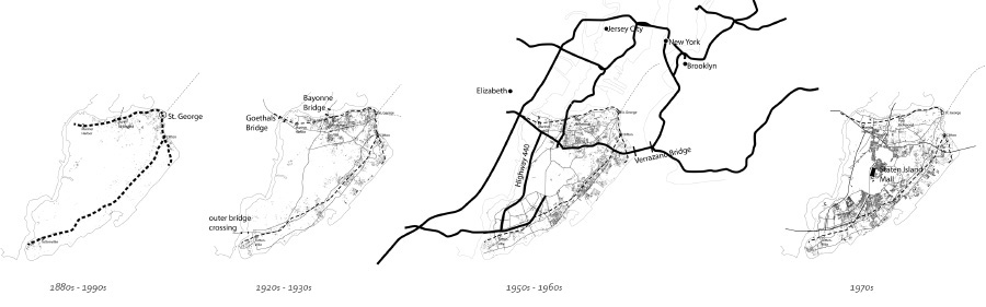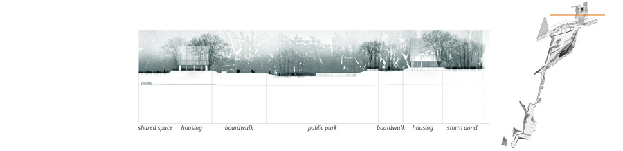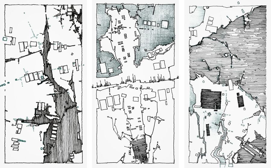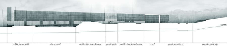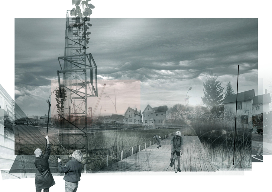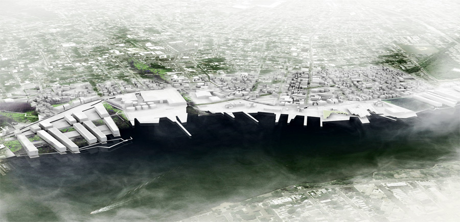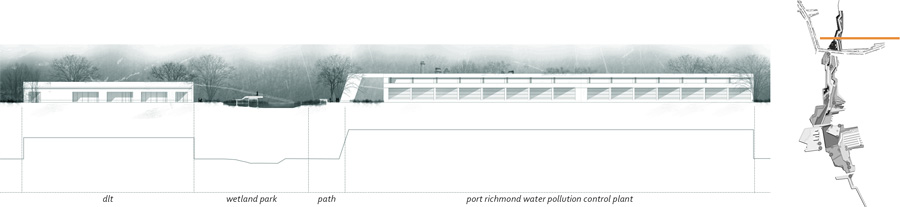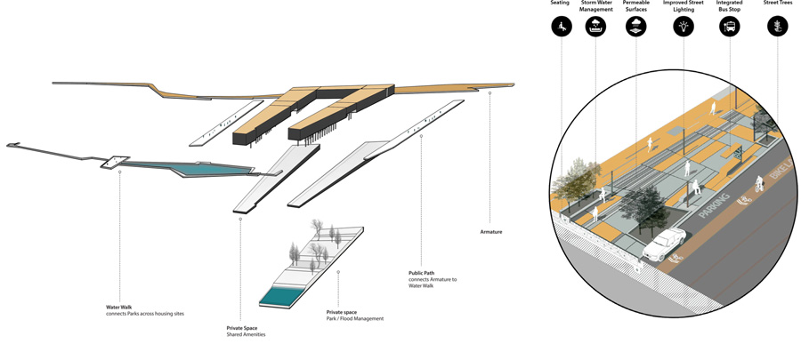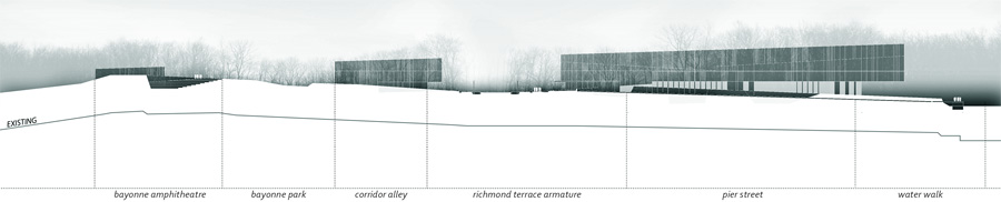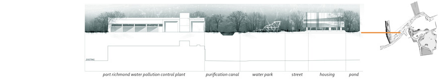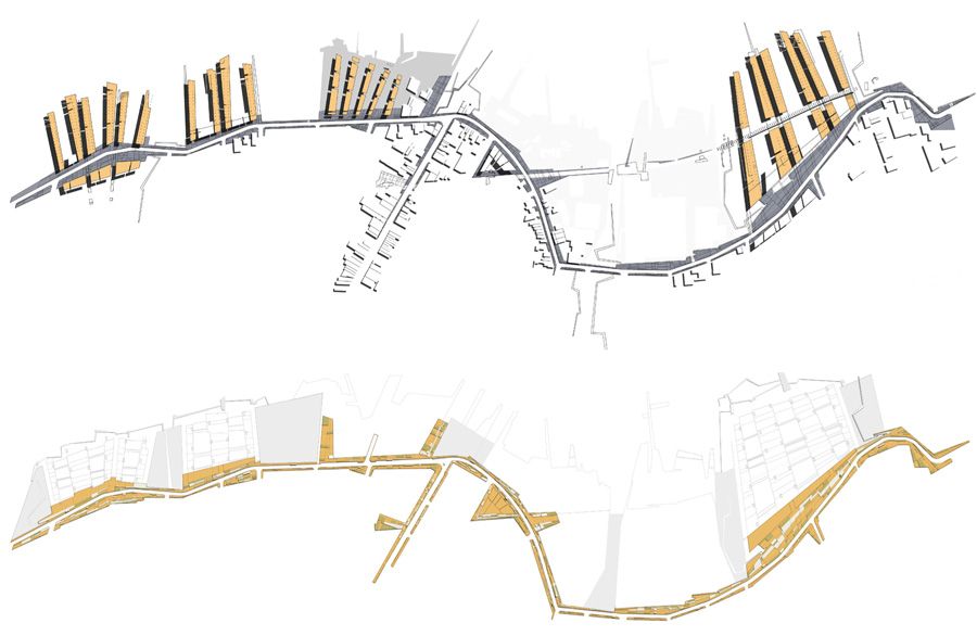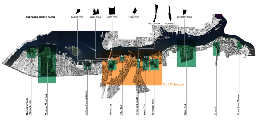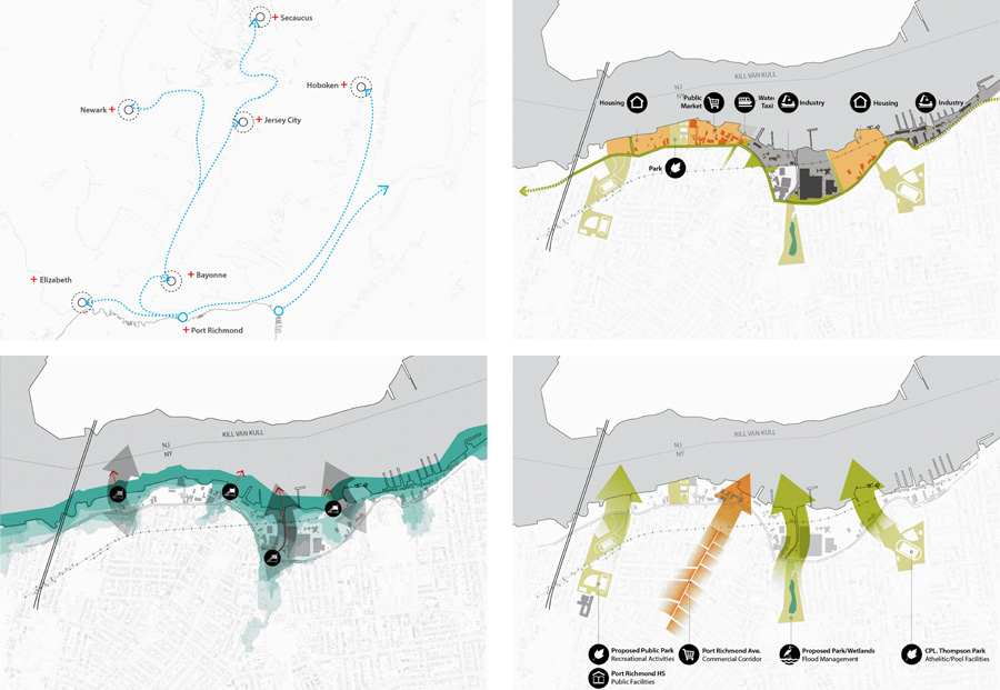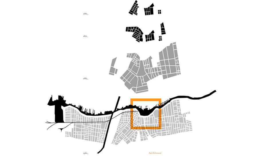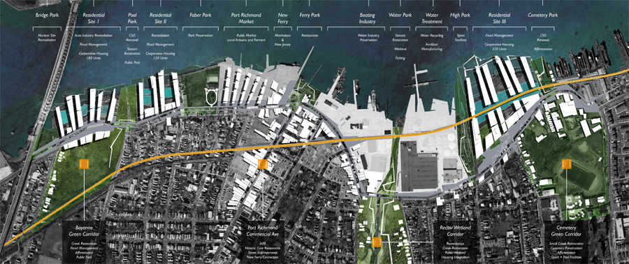 The waterfront remains the Port Richmond’s most valuable resource, and its preservation is crucial, both economically and ecologically. Our approach to reshaping the waterfront is not driven by land use, but by the contextual typology of pier structures aimed at extending the length of the shoreline. This strategy allows for an intervention sensitive to flooding and drainage issues, and for the restoration of ecological corridors that advance deep inland. The public armature consists of a series of coordinated street improvements within localized enlargements of Richmond Terrace, linked through public transportation and new bicycle lanes, and incorporating a water taxi service and a community market. The parks along the armature not only maintain the continuity of the green corridors and ensure recurrent public waterfront access, but also act as buffer zones between industrial and mixed‐use areas. scroll down to view |
