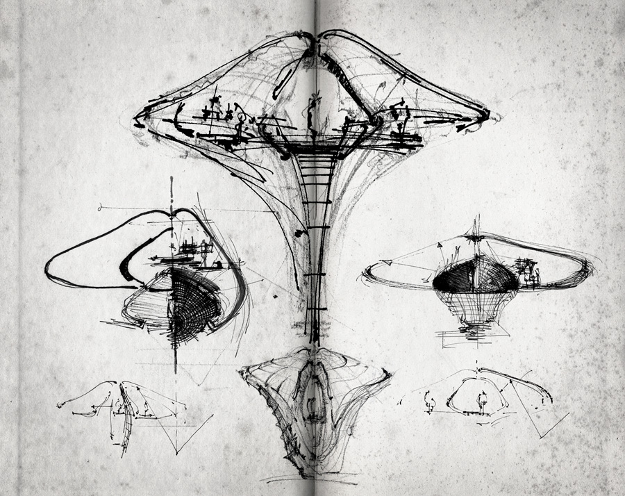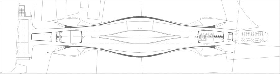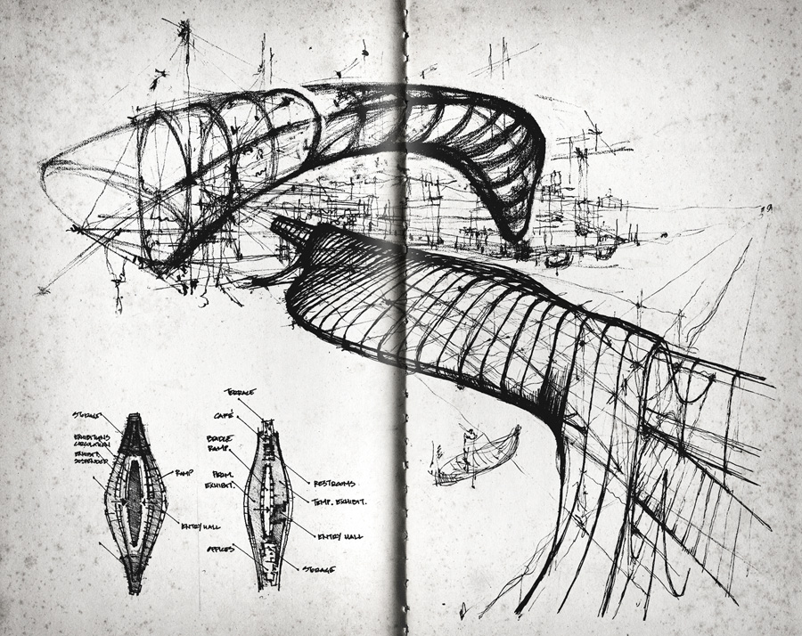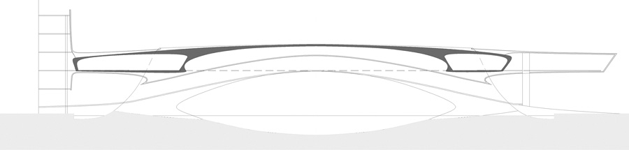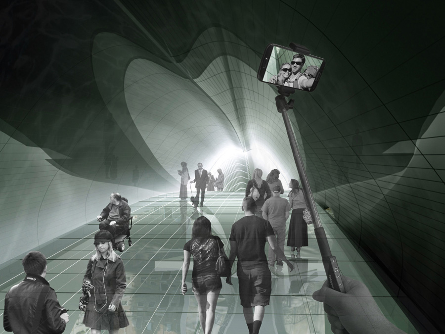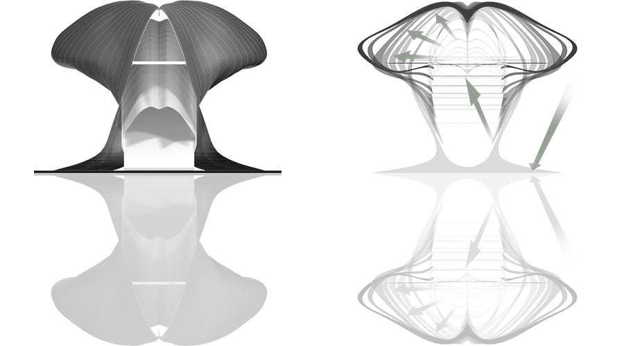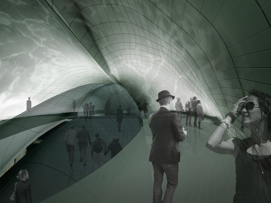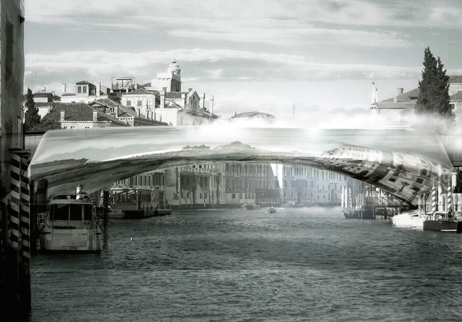 Venice can be experienced by either land or water. The new bridge will blur the distinction between these two circulation systems by introducing a mediating surface: glass. The glass path of the bridge arches through the “liquid” volume of the museum, allowing views of the water below and a continuous gaze at the opposite shore. The floor represents the only source of natural (indirect) light into the exhibition halls, while the glass path develops horizontally to form an elliptical circulation inside the galleries. The museum emerges from the water following the inverted trajectory of a drop. The polished stainless steel volume mirrors its environment to extend visually the specific street-like scape of Venice. At urban level, the bridge-museum deploys an inverted process of generating pedestrian circulation. Instead of raising the ground to cross the water, it is the sea that “moves” upward and facilitates the passage. Here, gravity pulls up, generating the museum in form of an inverted drop, and thus minimizing the width at shore and the height in the center. The inverted aspect is doubled by the “skylight” role of the glass floor. Light is reflected from water - which absorbs 80% of the damaging ultraviolet light - through the floor and into the inner cavity, where it becomes distributed into the exhibit spaces. Crossing the water through the inner-bottom cavity allows views in the exhibition halls without the need enter the museum.