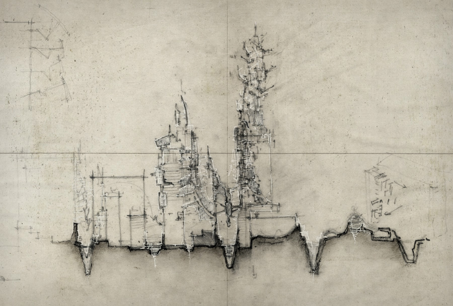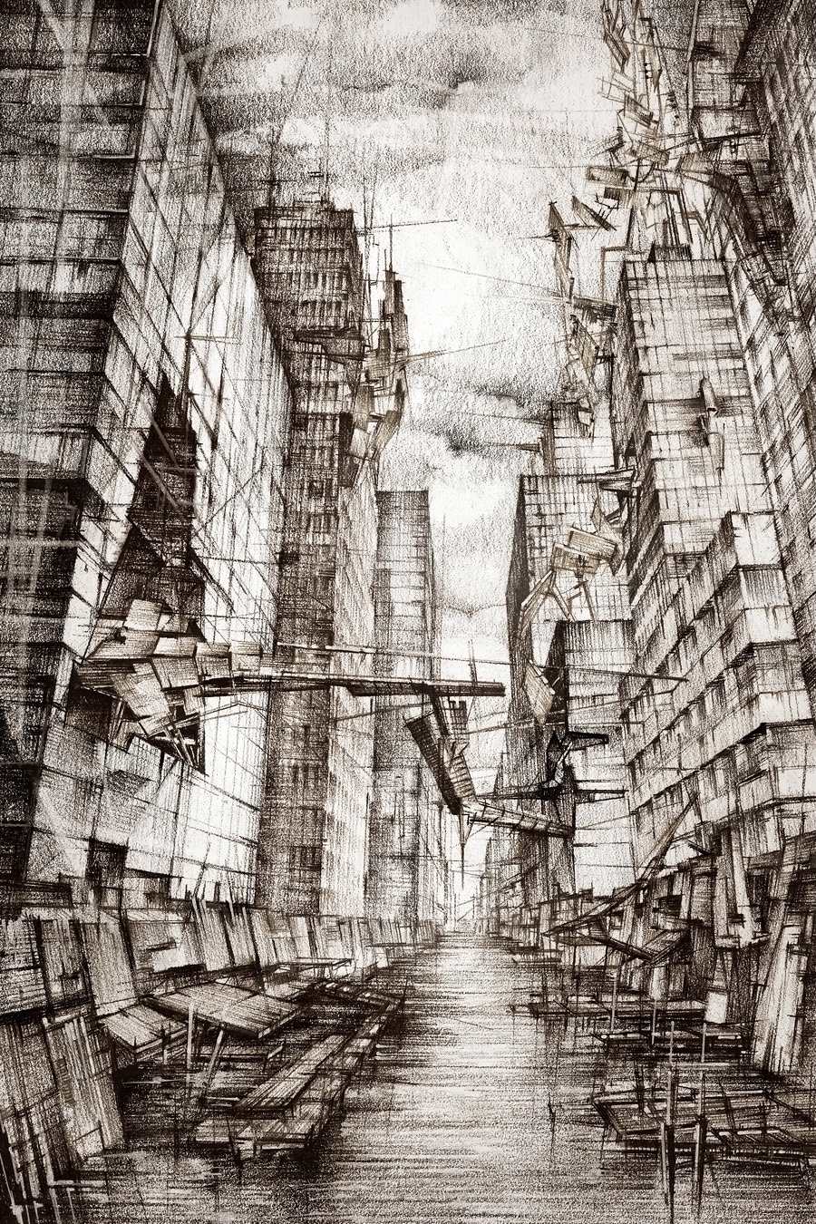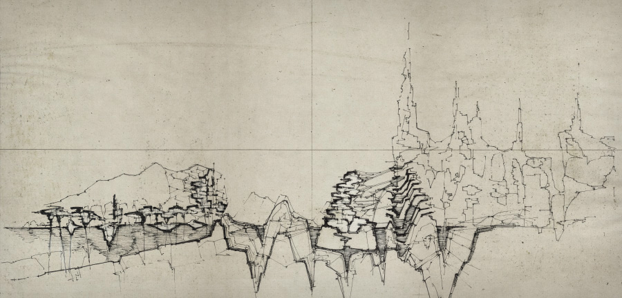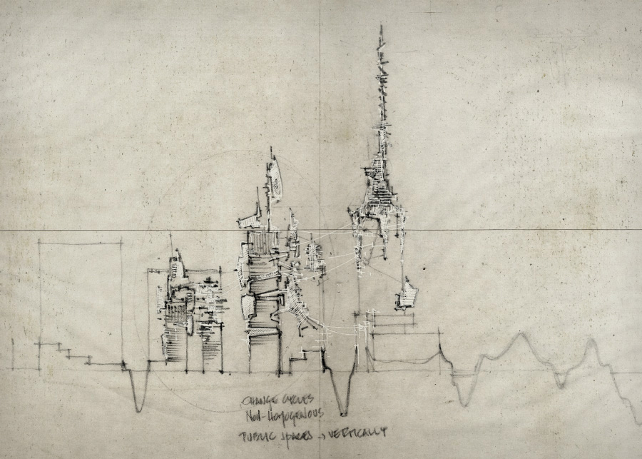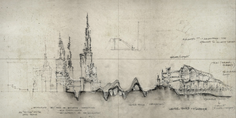 Garden Island. The existing character of residential blocks is gradually built up with individual terraced dwellings capable to sustain agricultural practices. Rainwater is collected inside a reservoir consisting of stackable ponds; each pond collects rainwater through moisture-activated panels to irrigate individual gardens. Salt water from adjacent channels is collected in underground reservoirs that provide geothermal energy through an open loop system. Highrise Islands. Existing buildings are being continuously refurbished with new environmental technology (fog catchers, photovoltaic panels) according to specific orientation and height, providing energy to sustain the island. New spaces are added onto and inserted through existing buildings; the once monolithic office building becomes fragmented, allowing for new uses and functional autonomy. As streets become water channels, the island turns towards itself, with public spaces flowing freely within and in between island buildings. Desalination Plant. Salt water is processed through rapid spray evaporation; the resulting salt is collected at the bottom of the desalination room and transported inland. Processed sweet water is stored in floating reservoirs, whose rocking motion produces in return energy for the desalination process. The photovoltaic skin covers the plant and supplements the energy for desalination. Park Islands and the Marina. The existing piers provide access for dwellings elevated on posts above water; wind turbines attached to each dwelling provide energy to sustain the dwellings. The mounds form an urban park capable to deal with rising tides, a dynamic landscape with direct access from the public spaces within each island. |
