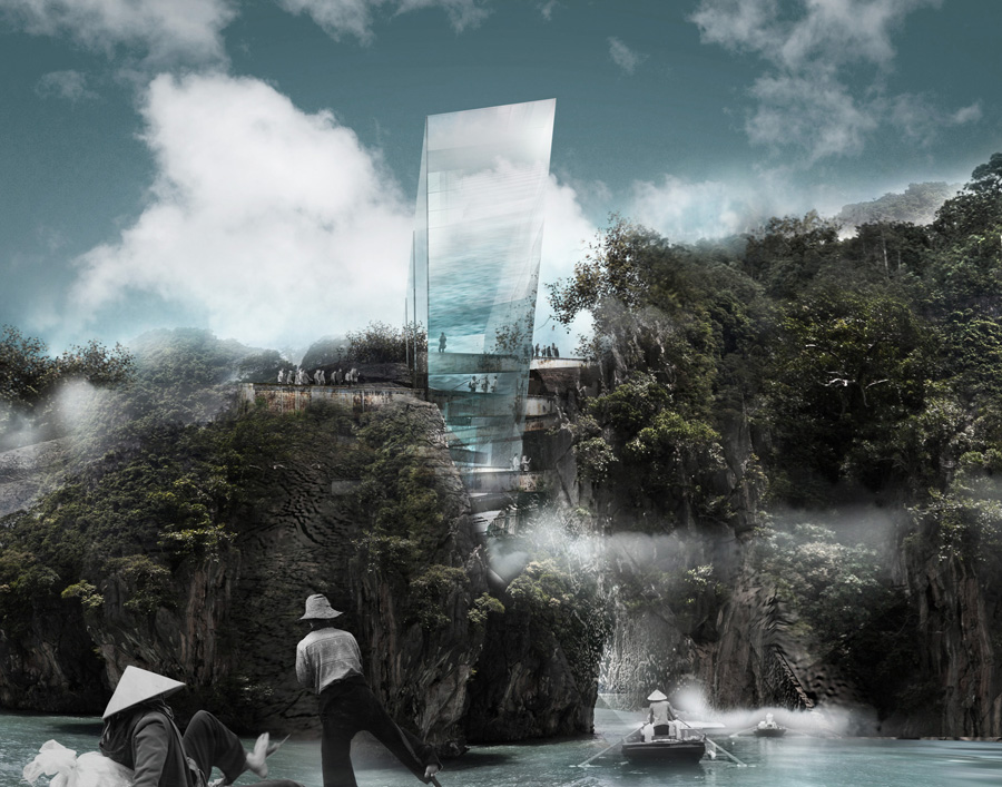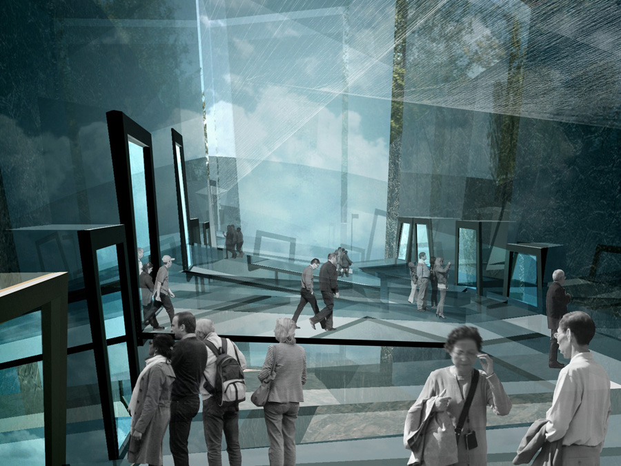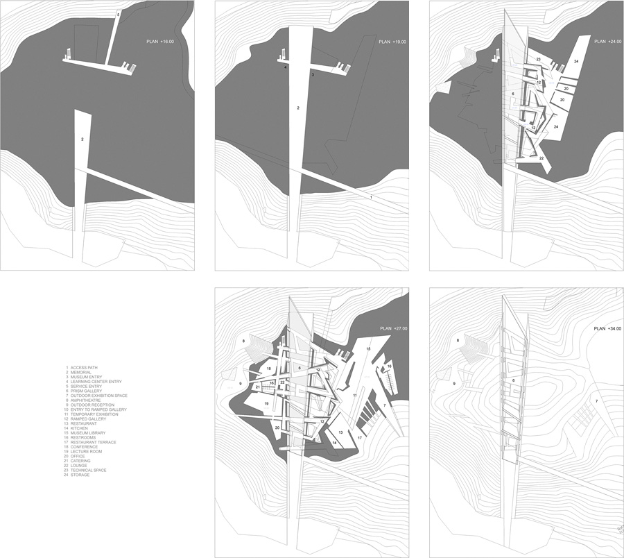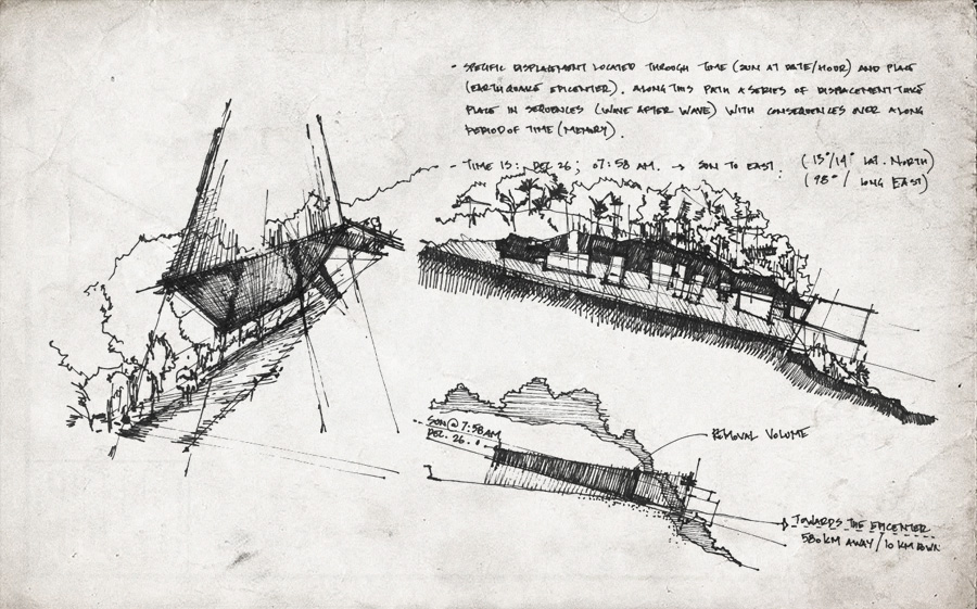 This project is the reflection of two different, yet interconnected aspects of recollection. The first one, requiring a conscious effort to remember, is represented by the museum and the learning center. The second one, involving contemplation, becomes the memorial. The museum, along with the other programmatic elements, is the result of a clear succession of events triggered by the Sumatra earthquake. A series of displacements are plotted onto the site, according to a precise timeline: from the time the earthquake occurred, and following the series of waves that flooded the land, to the moment the sea level returned to normal. These events are marked in space along the epicenter axis and in time, using the sun ray inclination. The displaced prism becomes the main exhibition space, one in which exhibits - objects of recollection - float freely. The zigzagging ramp moves in and out of the prism with the precision of its causality. It is frozen displacement. The memorial is the trace of this displacement, the physical absence replaced by countless shadows above, and infinite reflections and refractions from the prism. It is a place with no horizon, where the sea and the sky are one and the same. scroll down to view |