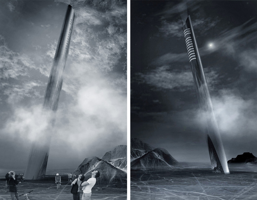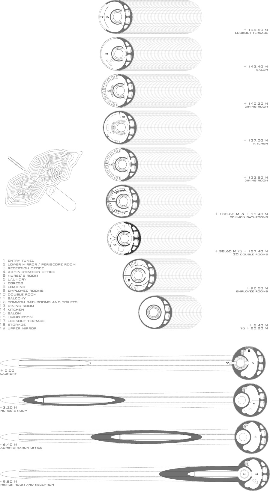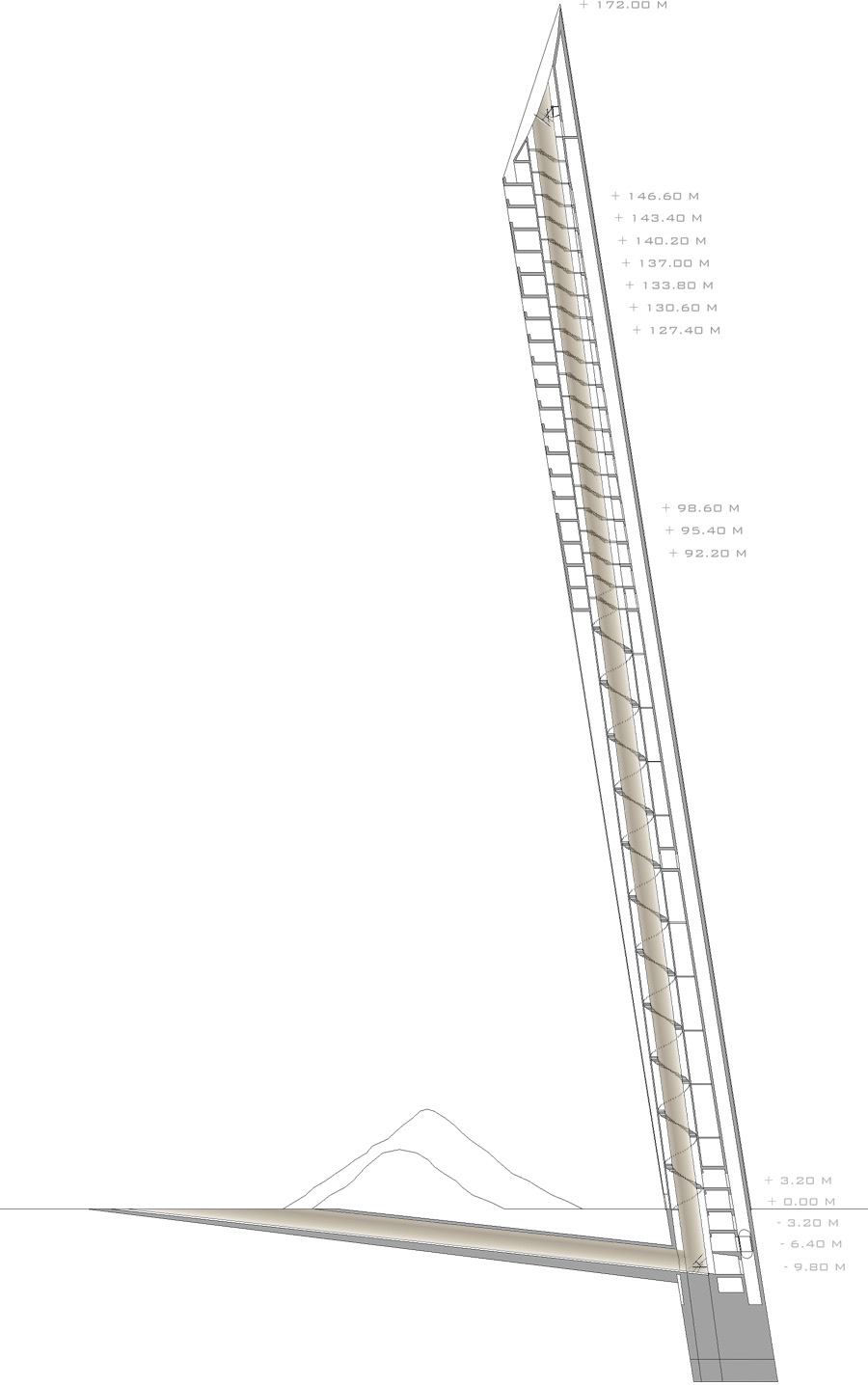 The tower is conceived as a large periscope to make the Nazca geoglyphs visible from the ground. A system of two mirrors - placed at the bottom and the top of the shaft - reflects images of the geoglyphs inside the tower. Below the bottom mirror, a system of magnifying lenses allows a more detailed exploration of the site. In order to cover the site in its entirety, the twelve-meter diameter periscope-tower is inclined towards the geoglyphs. The hollow shaft has a lesser inclination to structurally counterbalance the exterior solid tube by redistributing the concrete mass. Covered in a highly reflective polished stainless steel skin, the tower mirrors the geoglyphs when approached from northwest, and entirely blends with the sky when seen from opposite direction. Located on the southeast extremity of the site, the tower is accessible from the other side of the hills through a tunnel. Along with the tower’s hollow interior, the tunnel facilitates natural ventilation of the entire structure. In response to the unique value of the Nazca geoglyphs, the tower exhibits a reverential approach, announcing its presence more as an object in the territory than a building. In its simple appearance, the tower is in fact a utilitarian object, aimed at celebrating the local culture, as well as its global impact. scroll down to view |
