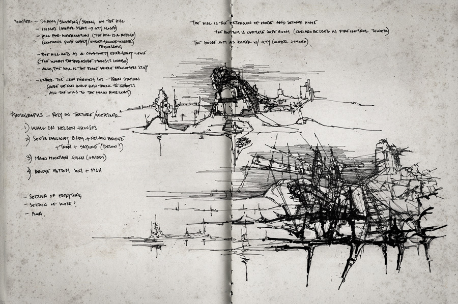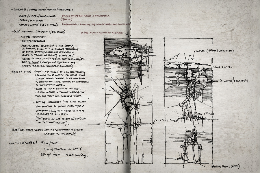 The current pattern of human settling and building constitutes the main force responsible for today’s environmental crisis. Changing this pattern requires a tremendous effort in both the political and social areas of life, as well as new practices and models of habitation and building. The need for a new, ecological way of building renders the existing expertise of architects and planners as obsolete. Furthermore, focus on sustainability is often [mis]placed on new constructions instead of addressing the highly damaging existing built environment. This project aims at starting the process of urban repair by transforming Atlanta’s Gulch into an inhabitable wetland. Located in the heart of downtown, the Gulch stands today as a vast, desolate area, covered with surface parking, rail tracks and host to an ever-increasing homeless population. Its surface - the city’s original ground level - fell underground along with the construction of vehicular viaducts and with the decline of the railroad industry. The current plans envisioned for this area by city officials depict an intermodal transit hub, a project sprinkled with slogans of “sustainability” and “mixed use”, whose rationale is more politically than evidence-based. The wetland’s main purpose is to rethink the use and management of one of Atlanta’s scarcest resources: water. Forming a new landscape, the wetland is intended as an urban “water facility”, where plants, birds, fish, and humans will cohabitate. The new facility consists of a series of viaduct parasitic constructions designed to collect waste and runoff water, and purify it through processes naturally occurring in a wetland. Given their efficiency in providing clean water, the new constructions will become in time sought-after shelters and grow more complex to offer diverse nesting opportunities. The filtered water will irrigate the adjacent farmland, with any excess returning to the “nests” via advanced processing facilities built in the heart of the marsh. These mountain-like constructions will support a series of recycling related activities, and as the population soars will provide opportunities for becoming socially active spaces. At its full capacity, the Gulch wetland will provide clean recycled water to a population of 12,000. The construction of the wetland is as important as its function. Here, new ways of building become linked to novel social practices and a redefinition of the relationship between humans and environment. The wetland’s heterotopic presence within the heart of a generically constructed downtown may not only empower its currently disenfranchised population, but may also contribute to a fairer base for social dialogue between groups of a still divided city. scroll down to view |